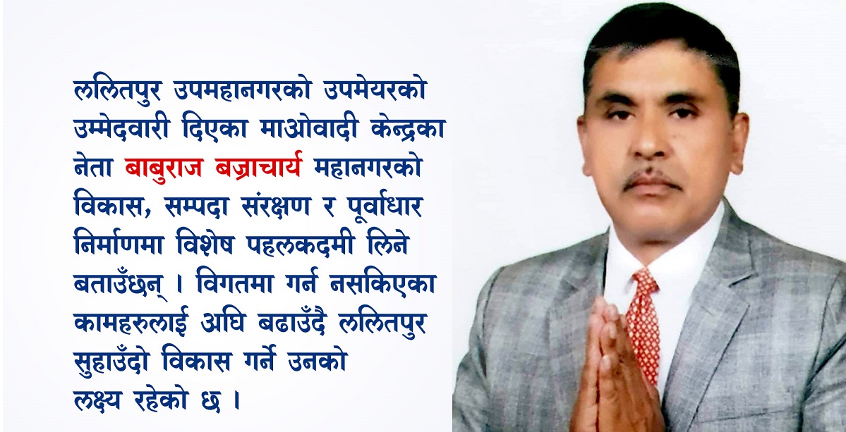 ललितपुर महानगरपालिकामा सत्तारुढ गठबन्धनबाट उपप्रमुखमा बाबुराज बज्राचार्य उम्मेदवार छन् । सत्तारुढ गठबन्धनबीच भएको सहमतिअनुसार ललितपुर महानगरमा प्रमुख नेपाली काँग्रेसका चिरिबाबु महर्जन र उपप्रमुख पदमा नेकपा (माओवादी केन्द्र) का बाबुराज बज्राचार्य प्रत्यासी छन् । उपप्रमुख पदमा उम्मेदवारी दिएसँगै बज्राचार्यले चुनावी प्रचार प्रसार र घरदैलो कार्यक्रमलाई तीब्रता दिएका छन्। उनै बज्राचार्यसँग चुनावी कार्ययोजनाको बारेमा गरिएको कुराकानीको सम्पादित अंशः