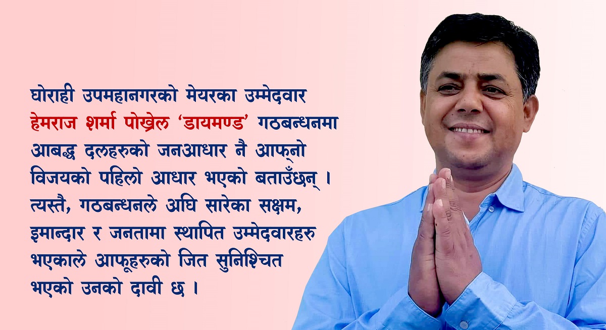 नेकपा (माओवादी केन्द्र) का केन्द्रीय सदस्य हेमराज शर्मा पोख्रेल यही बैशाख ३० गते हुने स्थानीय तह निर्वाचनमा घोराही उपमहानगरपालिकाको मेयर पदमा उम्मेदवारी दिएर चुनावी मैदानमा होमिएका छन् । सत्तारुढ पाँच दलीय गठबन्धनको तर्फबाट मेयर पदको उम्मेदवार भएका पोख्रेल चुनावी अभियान शुरु भएसँगै आफ्नो जित सुनिश्चित भइसकेको दावी गर्छन् । उनको दावी अनुसार गठबन्धनमा आबद्ध दलहरुको घोराहीको जनआधार, गठबन्धनको तर्फबाट निर्वाचनमा होमिएका उम्मेदवारहरुको लोकप्रियता र विपक्षी गठबन्धनका उम्मेदवारहरुले विगतमा जनतासँग गरेका वाचा पूरा नगरेको हुँदा आफूहरुलाई मतदाताले यसपटक अवसर दिने बताउँछन् ।