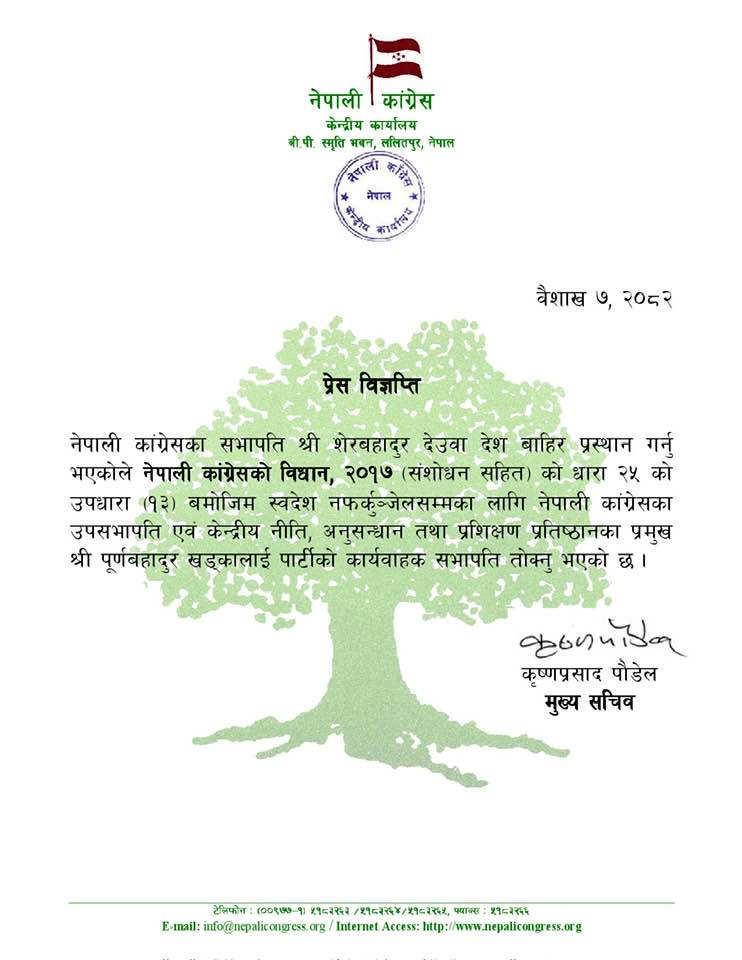 सभापति शेरबहादुर देउवा देश बाहिर प्रस्थान गरेकाले खड्कालाई कार्यवाहक सभापतिको जिम्मेवारी दिइएको नेपाली कांग्रेसले जनाएको छ।